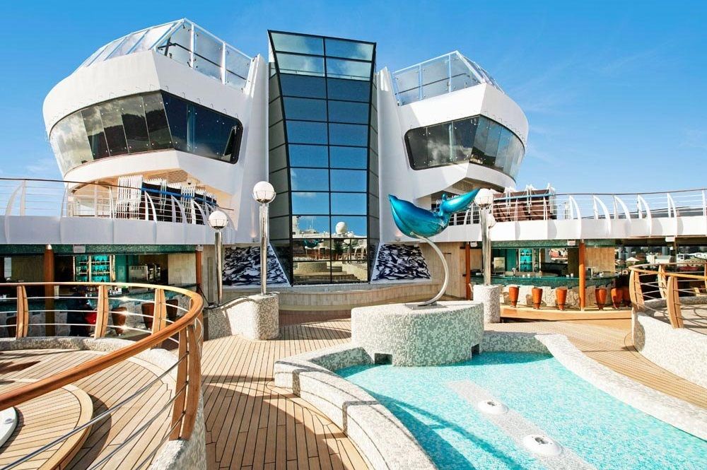 Suítes luxuosas, mordomo 24 horas, concierge exclusivo, lounge panorâmico, restaurante gourmet e piscina privativa, São as melhores cabines do navio.